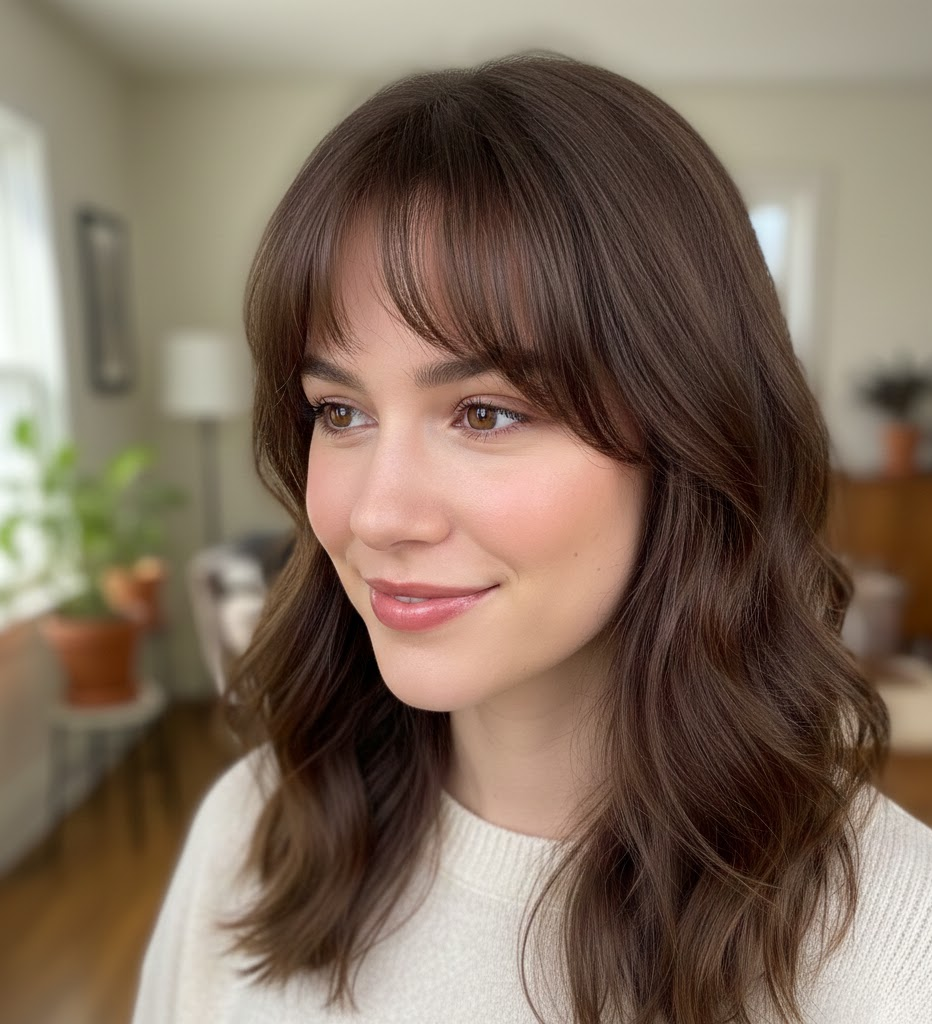 - Why it works: Softly frames the face, hides forehead lines, and adds softness to facial features.