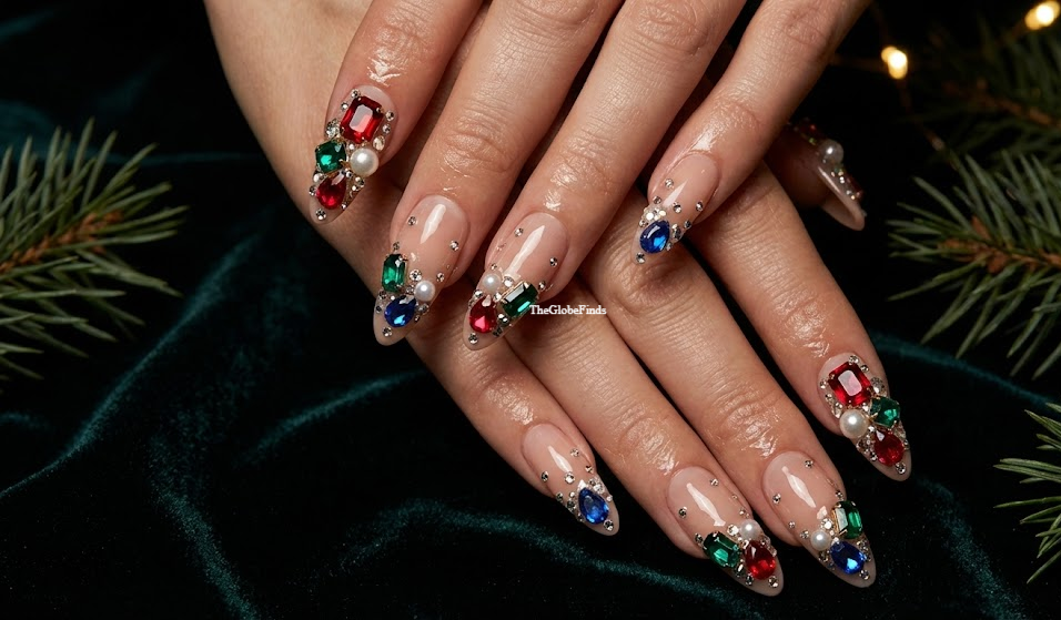 If you want your Christmas nails to feel truly luxurious, sculpted jewel accent nails are the ultimate statement. Set on dramatic coffin or stiletto shapes, this design pairs a rich jewel-toned base — think emerald, ruby, or sapphire — with one fully embellished accent nail on each hand.