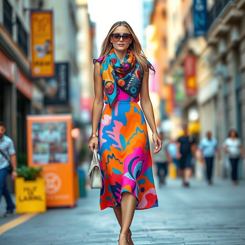 A fashionable woman walks on the lively street and the woman is wearing a chic mid length dress in a bold mix of vibrant blues, oranges and pinks. The playful yet sophisticated pattern is completed by a colorful scarf around her neck, with abstract designs that pop with color. The modern, effortless style with a touch of vibrancy is completed with oversized sunglasses, a minimalist handbag, and strappy sandals.