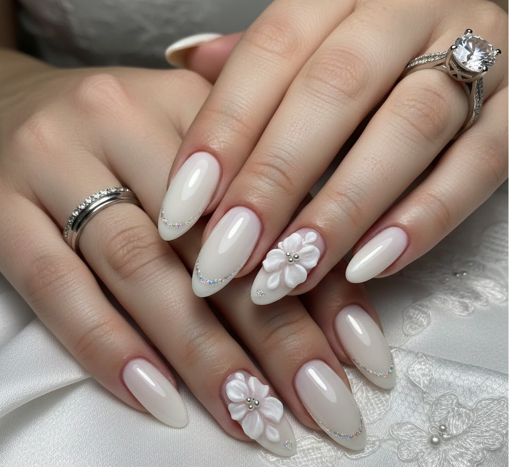 Floral nail designs bring a soft, romantic vibe that’s perfect for spring and summer weddings. Hand-painted flowers or pressed floral details add charm and femininity.