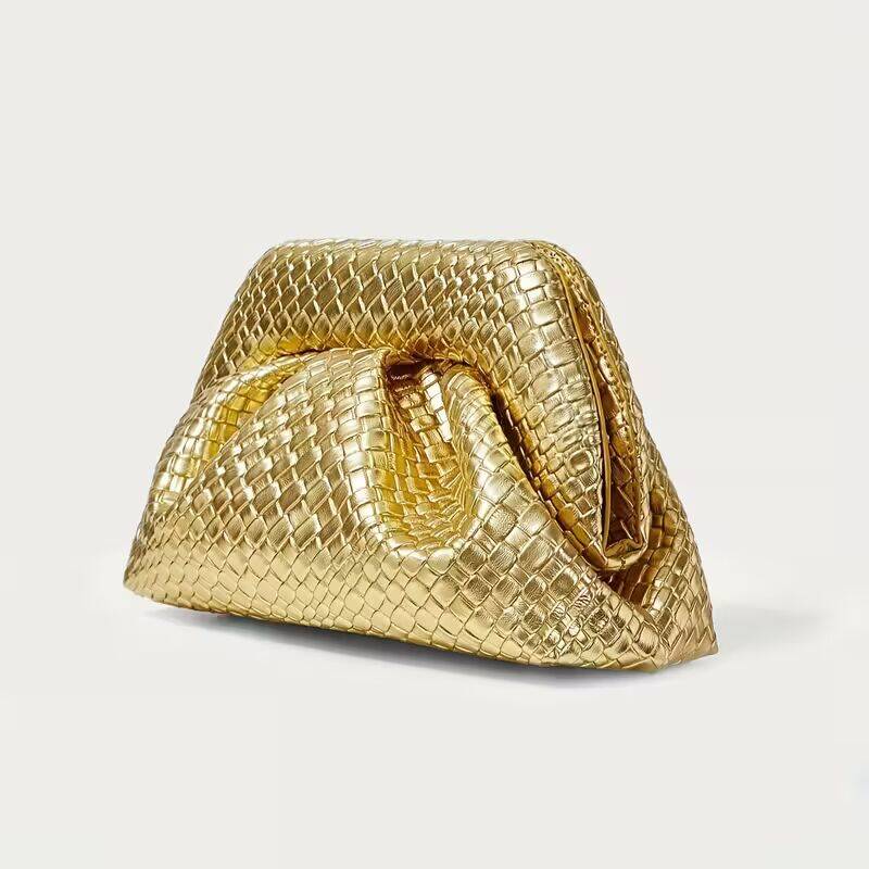 A gold woven embossed clutch that blends texture and shine - the ultimate accessory for effortless sophistication.